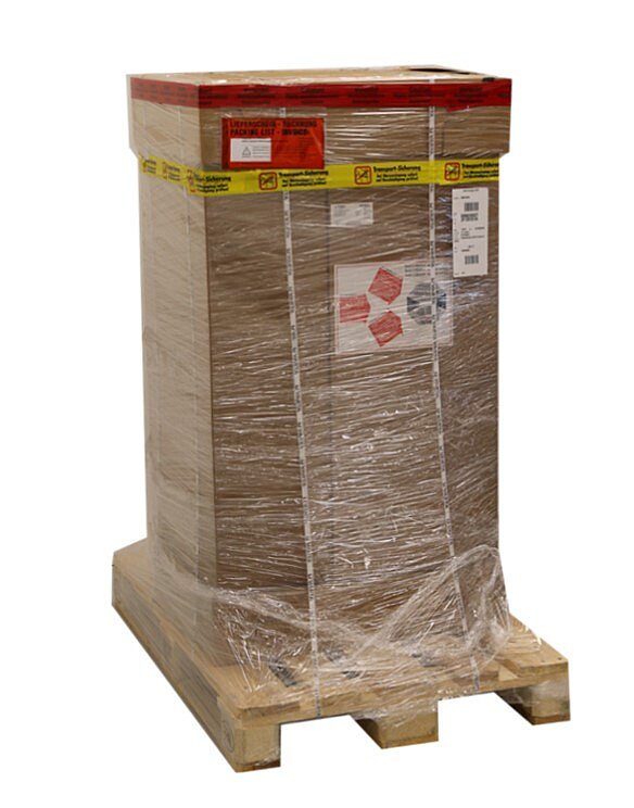 Batterieschrank und Batteriemodul werden auf jeweils einer Palette angeliefert. Der Batterieschrank verfügt dabei über einen Schocksensor.